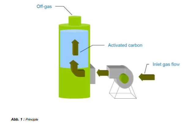 compounds are adsorbed. After treatment the clean air is discharged into the atmosphere via the clean air
